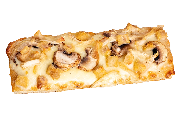 A slice pizza with smoked chicken, chicken nugget, mushroom, mozzarella cheese, truffle oil, and tartar sauce.