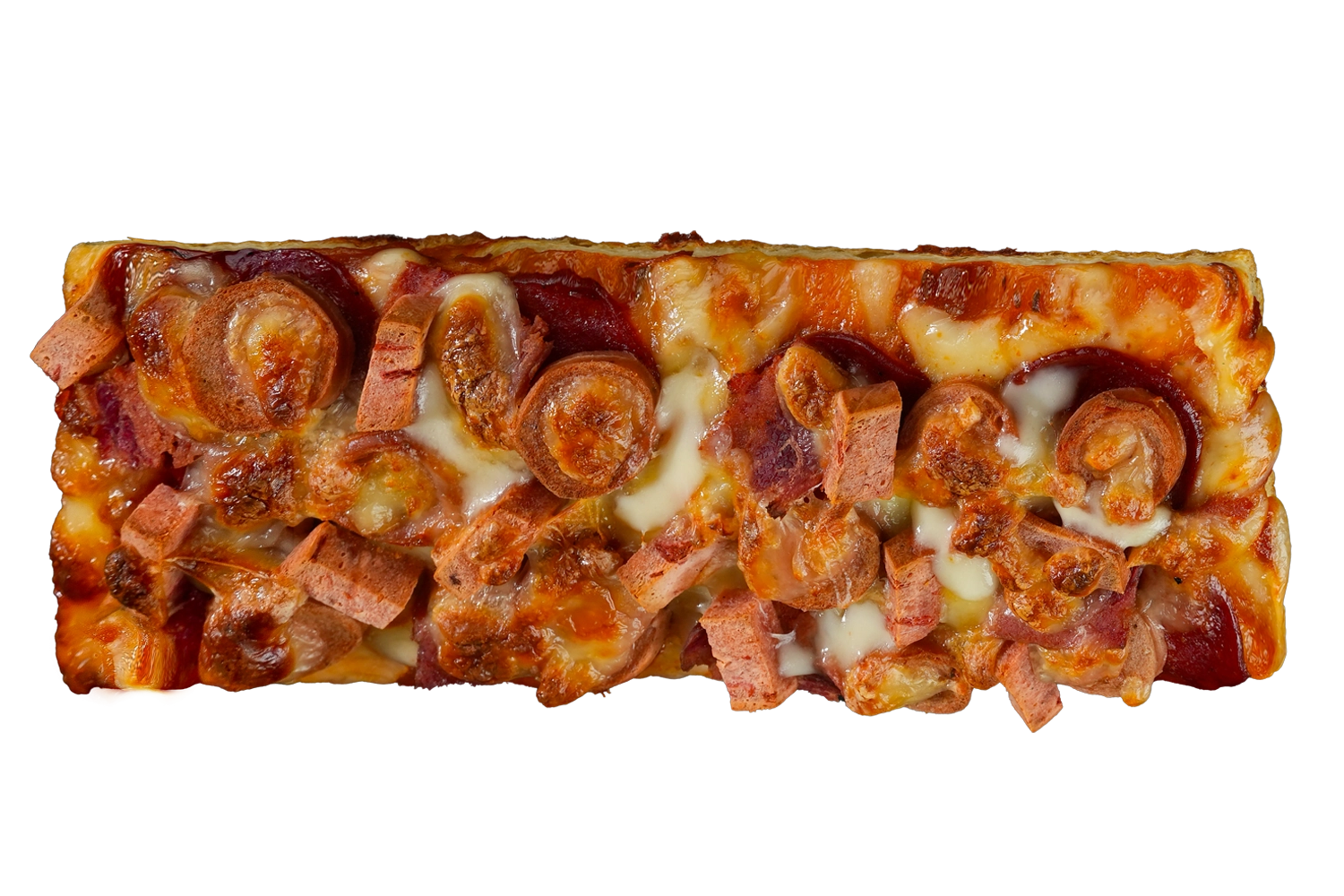 a slice pizza with beef pepperoni, smoked beed, sausage, corned beef, mozzarella cheese and tomato sauce
