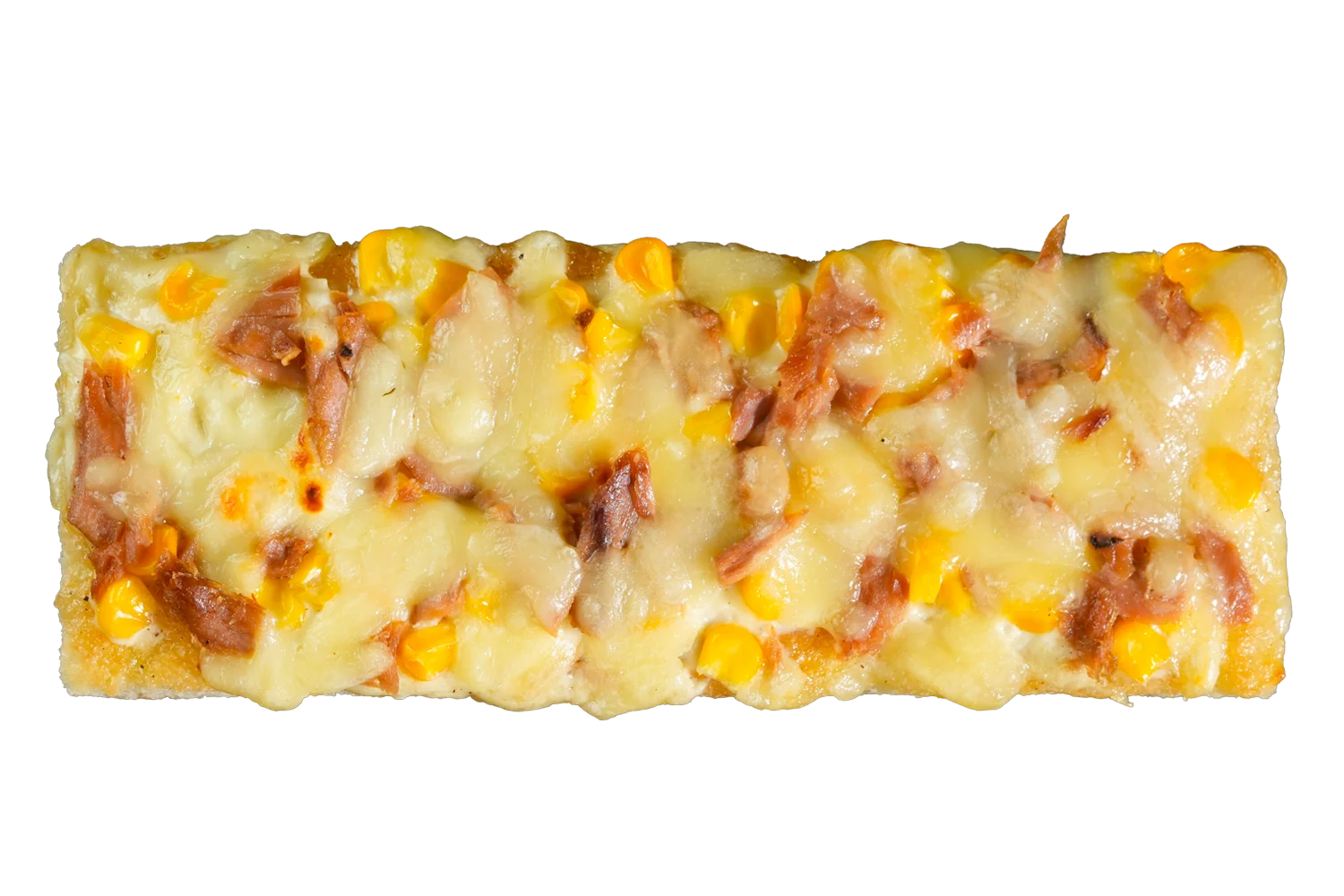 a slice pizza with tuna, corn, mozzarella cheese and tar-tar sauce